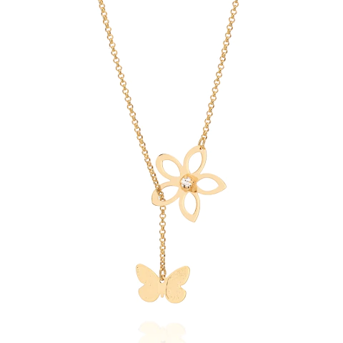 CCORDÃO ROMMANEL BANHADO A OURO 18K FIO PORTUGUÊS COM FLOR E BORBOLETA